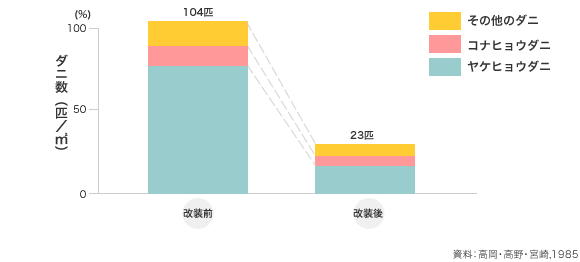 ぜん息やアレルギー性皮膚炎などの原因に、ダニやハウスダストがあげられます。床をカーペットからフローリングに替えるだけで、木材の調湿効果や木材に含まれる成分が有効に働き、ダニが減少します。